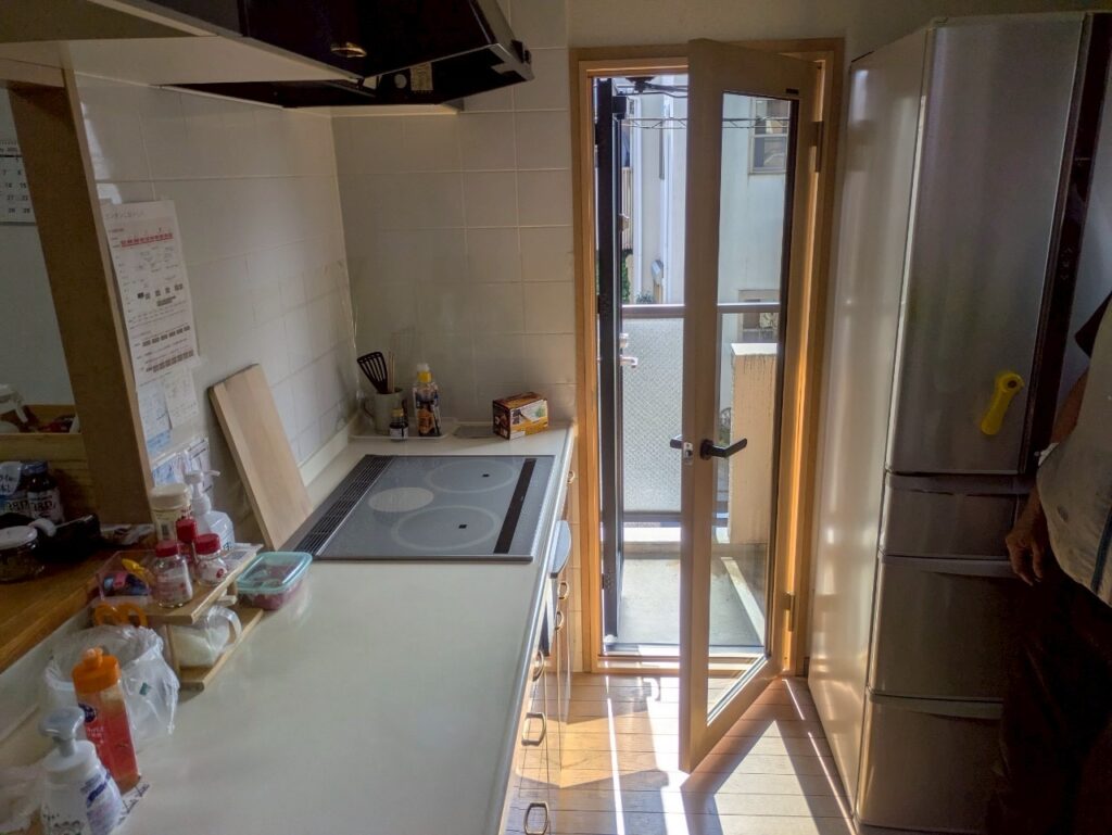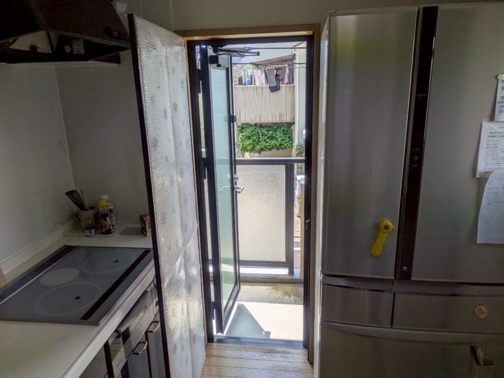 台所のコンロ横にある勝手口は、外との出入りに便利な一方で、断熱性が低く冷気の侵入口となっていました。料理中に立っていると足元から冷気が上がってきて、特に冬場の調理作業が辛い状況でした。勝手口ガラスにも結露が発生しやすく、水滴が床に垂れてしまうこともありました。また、西日が強く当たる場所でもあり、夏場は熱気がこもりやすく、年間を通じて快適性に欠ける窓でした。限られたスペースながら、断熱と遮熱の両面での改善が求められていました。