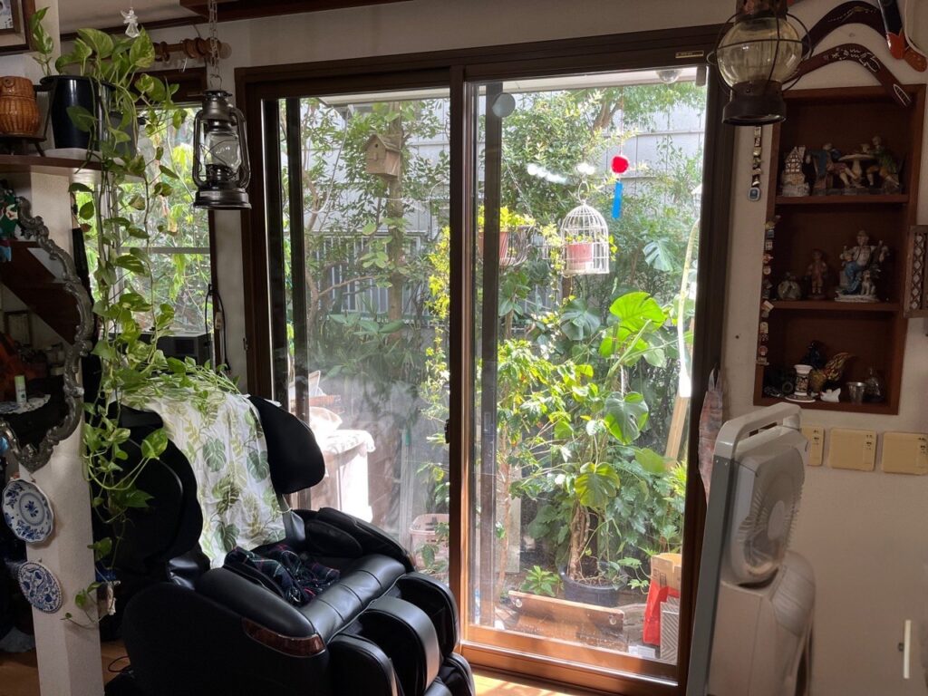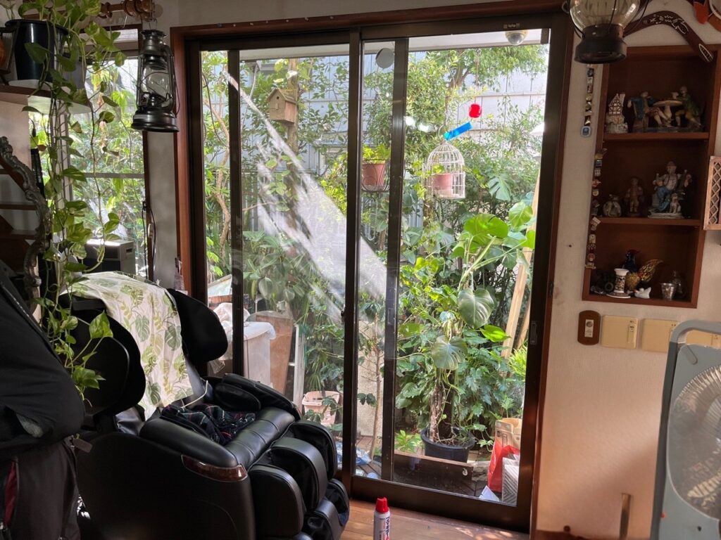 1階リビングの掃き出し窓は面積が大きく、庭の景色を楽しめる反面、室内の快適性に大きく影響する窓でした。窓が大きいほど外の暑さや寒さの影響を受けやすく、冷暖房を使っても窓際だけ温度差が出やすくなります。特に、くつろぎの時間を過ごすリビングでは、足元や窓の近くが落ち着かないと部屋全体の満足度が下がってしまいます。植物や家具に囲まれた素敵な空間であっても、夏の日差しや冬の冷気が入りやすければ、本来の居心地の良さを十分に活かしきれません。家族が長く過ごす場所だからこそ、窓の性能を高める必要があることが伝わる施工前の状態でした。
