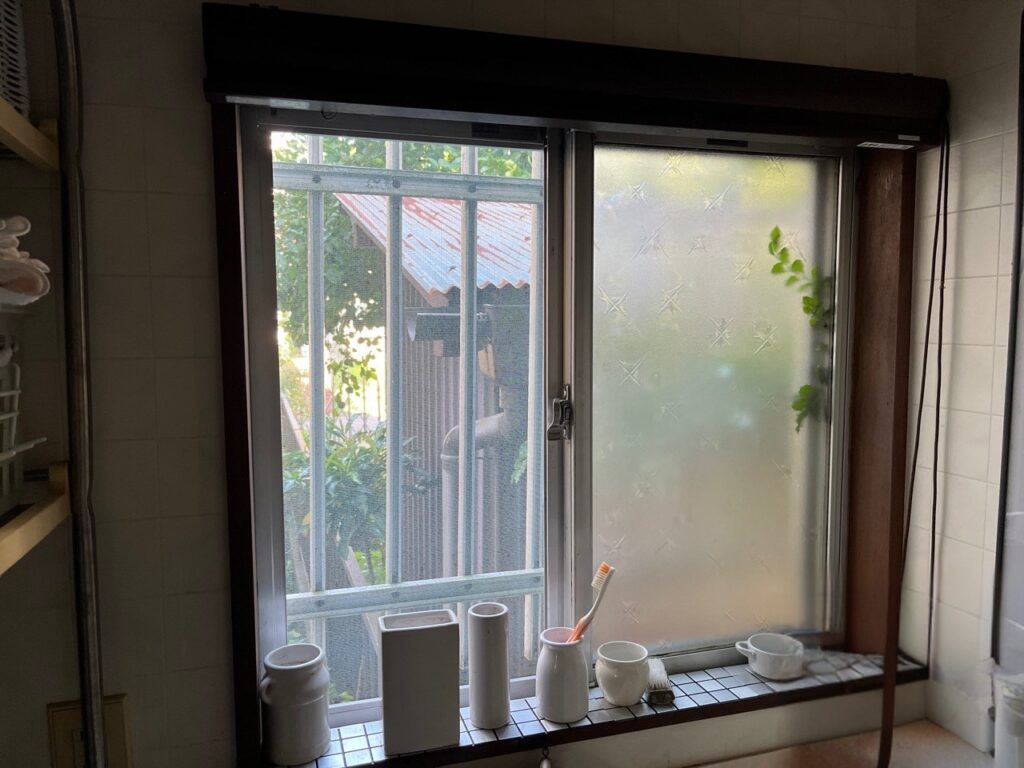 キッチンシンク前の横長の窓は、明るさを取り込みやすい一方で、外気の影響を受けやすい場所でした。調理や洗い物でお湯を使う機会が多いため、窓まわりの温度差が出やすく、朝晩のひんやり感も気になりやすい状態でした。窓の近くに立つ時間が長いキッチンでは、この少しの冷たさが毎日の家事ストレスにつながります。さらに、窓辺に物を置ける便利なスペースがあるぶん、結露が出るとこまめな拭き取りやお手入れも負担になりやすい環境でした。見た目には大きな傷みがなくても、使うたびに小さな不快が積み重なっていたことがわかる施工前の状態です。