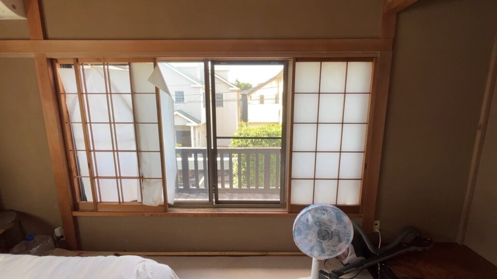 寝室の古い障子は経年劣化でボロボロの状態でした。障子紙に大きな破れがあり、光が漏れて眩しく、プライバシーも保てない状況。紙の変色や汚れも目立ち、見た目も悪くなっていました。破れた部分から隙間風が入り、断熱性能は皆無に等しい状態でした。頻繁な張り替えメンテナンスも負担で、破れるたびに応急処置を繰り返していました。古い障子では防音効果もなく、外部騒音で安眠を妨げられることも多々ありました。