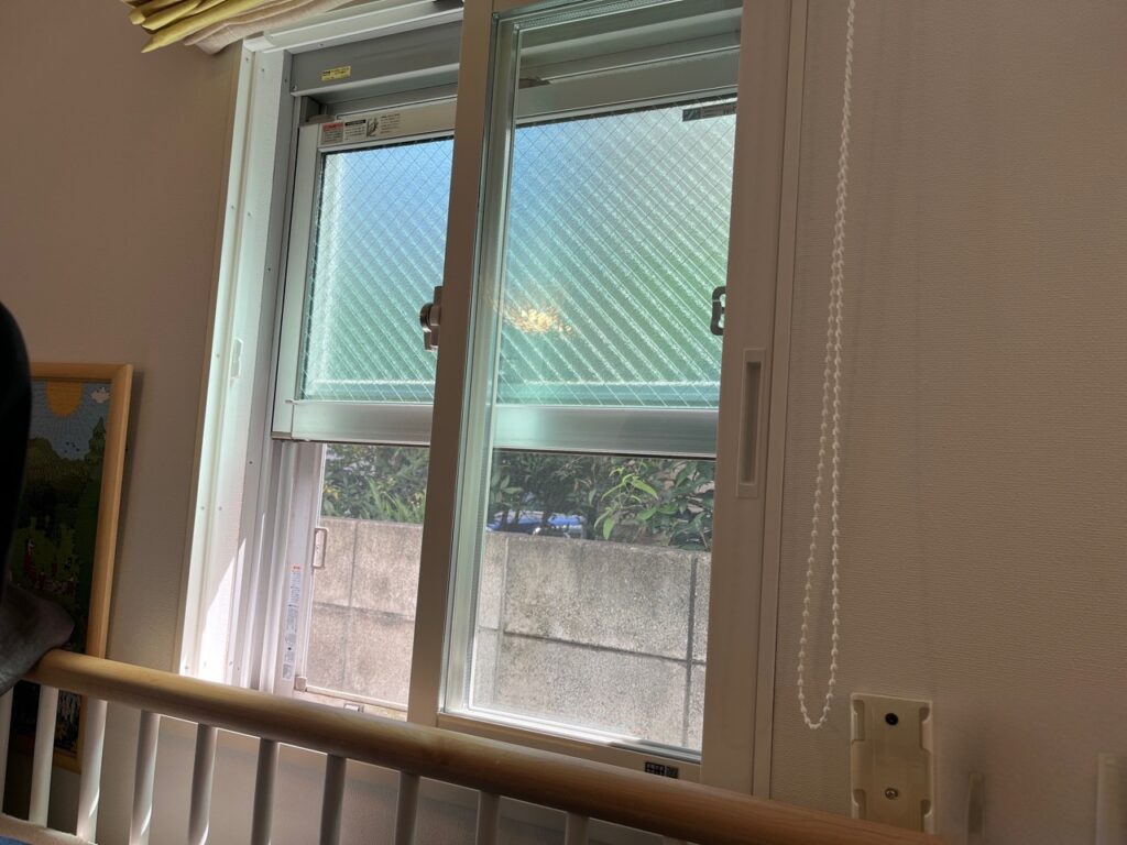 ベビーベッド横の上げ下げ窓には、引き違いの内窓を新たに設置し、赤ちゃんが過ごす空間の温熱環境を整えました。既存窓との間に空気層ができることで、冬の冷気や夏の熱気が伝わりにくくなり、窓際の温度差をやわらげる効果が期待できます。さらにLow-E複層ガラスは、外気の影響を抑えるだけでなく、結露対策にも有効なため、小さなお子様がいるご家庭にも安心感があります。外から伝わる細かな生活音もやわらぎ、眠りを妨げにくい、落ち着いたお部屋づくりにつながりました。赤ちゃんのそばの窓だからこそ、見た目だけでなく性能面をしっかり高めるリフォームになっています。